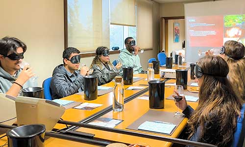 O workshop “Entre Taças e Mistérios – Prova de Vinhos às Cegas” desafiou os participantes a realizar um exercício de avaliação sensorial, com o intuito de identificar características distintas dos vinhos e interpretar os resultados obtidos. A iniciativa destacou a importância da precisão, do sentido crítico e da experiência sensorial — competências essenciais na área da restauração e hotelaria.
